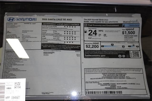 Hampton Gray 2025 Hyundai Santa Cruz 4D Crew Cab SE 2.5L I4 21/29 City/Highway MPG 8-Speed Automatic with SHIFTRONIC AWD