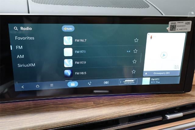 - Radio: AM/FM/HD Bose Premium Audio System -inc: 12 speakers including subwoofer, external amplifier, 12.3" wide touchscreen, Apple CarPlay and Android Auto, Bluetooth® hands-free w/wireless audio streaming, dynamic voice recognition, USB connectivity, SiriusXM, Blue Link+ connected car system, over-the-air updating capability, navigation system including traffic flow w/incident data via HD Radio (HERE) and rear seat quiet mode