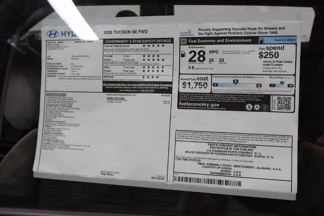 Ultimate Red 2026 Hyundai Tucson 4D Sport Utility SE 2.5L I4 DGI DOHC 16V LEV3-SULEV30 187hp 25/33 City/Highway MPG 8-Speed Automatic with SHIFTRONIC FWD
