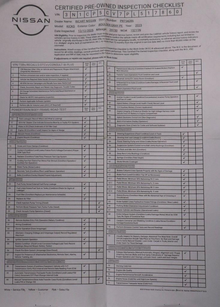 The 2023 Nissan Kicks SV delivers efficient urban versatility with its 1.6L DOHC 4-cylinder engine paired to an Xtronic CVT for smooth, economical driving. Inside, it enhances comfort and connectivity with a 7" Advanced Drive-Assist Display, Apple CarPlay and Android Auto, Intelligent Cruise Control, and upgraded cloth seating with a rear-seat armrest. Safety is strengthened through Nissan Safety Shield® 360, including Automatic Emergency Braking, Blind Spot Warning, Rear Cross Traffic Alert, Lane Departure Warning, and High Beam Assist. Experience it in person at Ricart Automotive Used Car Factory.