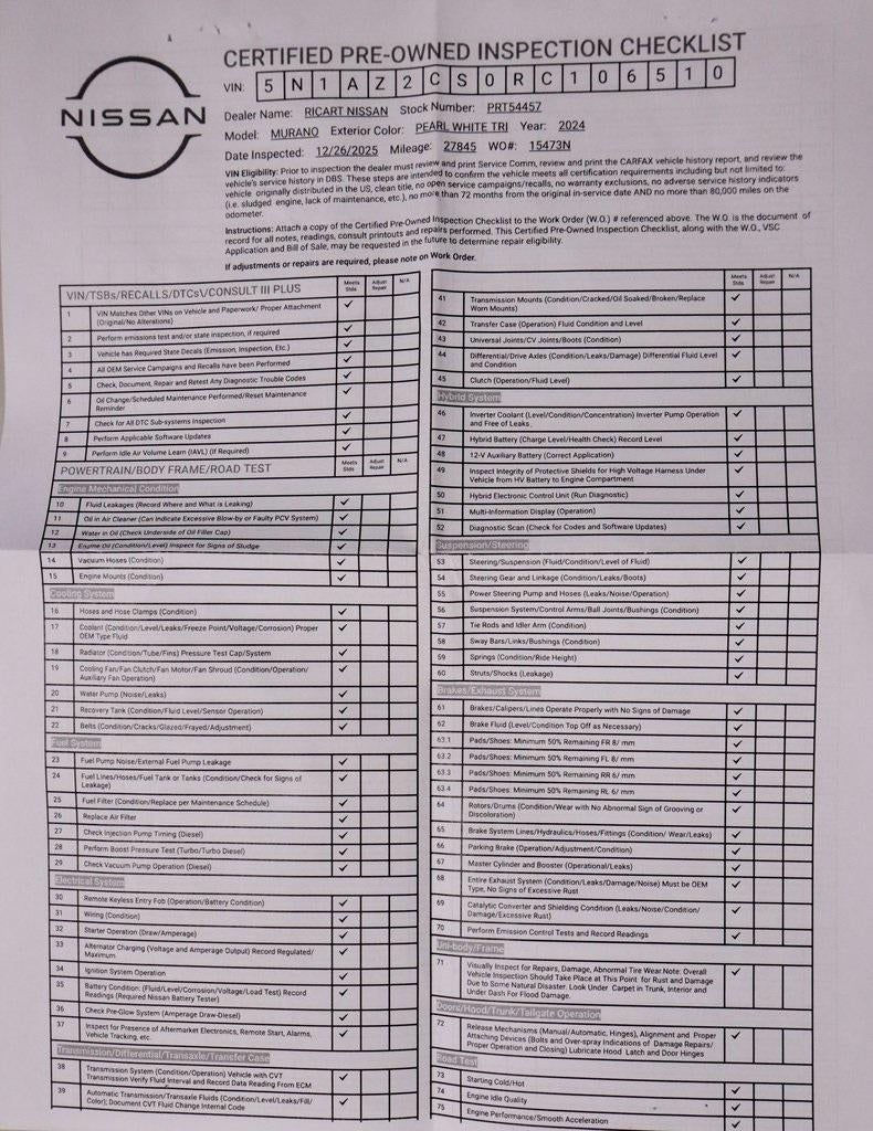 Pearl White Tricoat 2024 Nissan Murano SL 4D Sport Utility 3.5L V6 DOHC 24V 20/28 City/Highway MPG CVT with Xtronic AWD